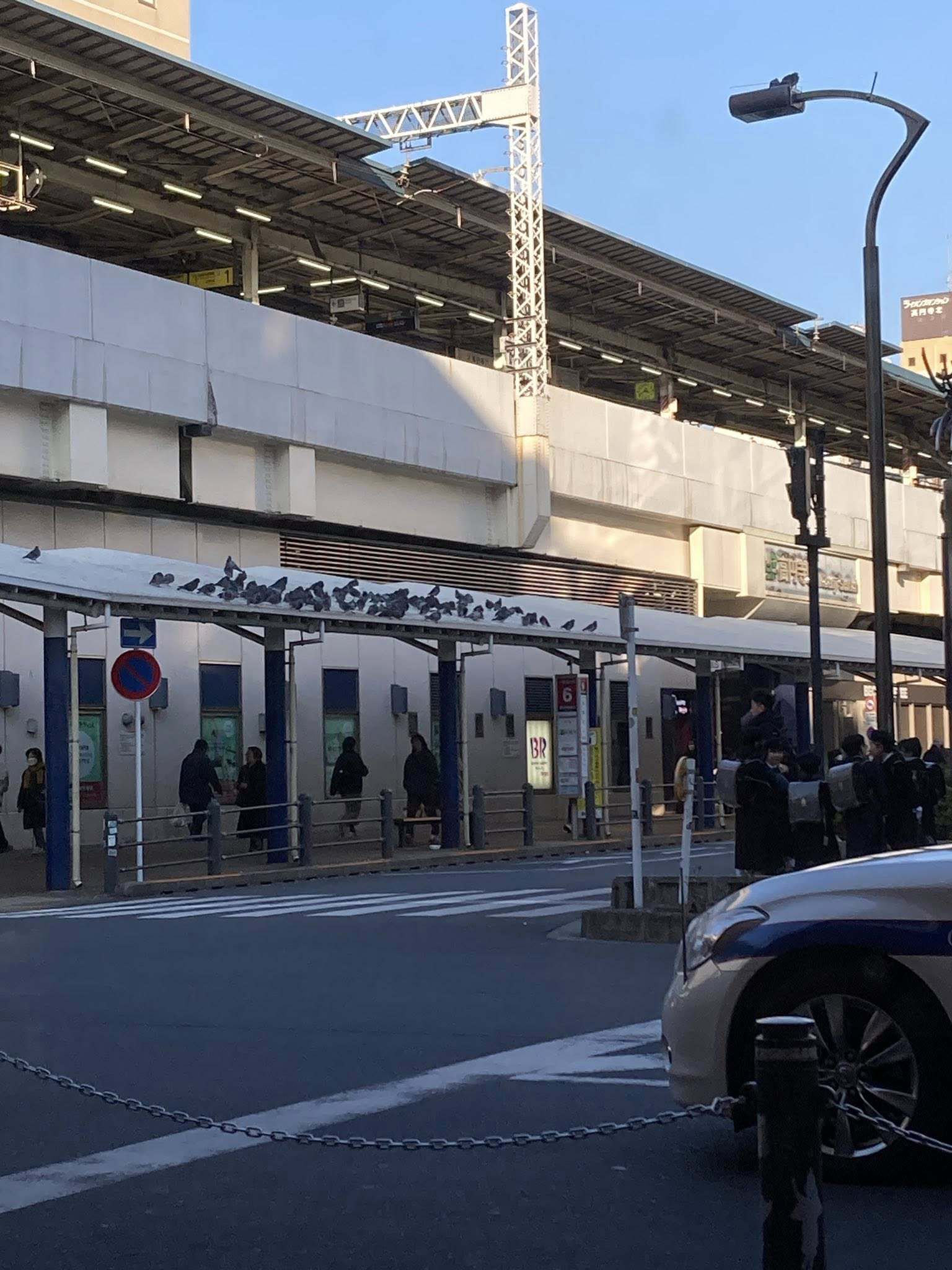 駅の屋根には鳩の集団が…すごい